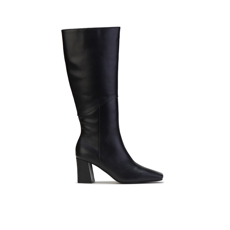 두꺼운 발 뒤꿈치 를 가진 검은 가죽 의 무릎 높이 의 부츠, 현대적이고 유행 있는 스타일
